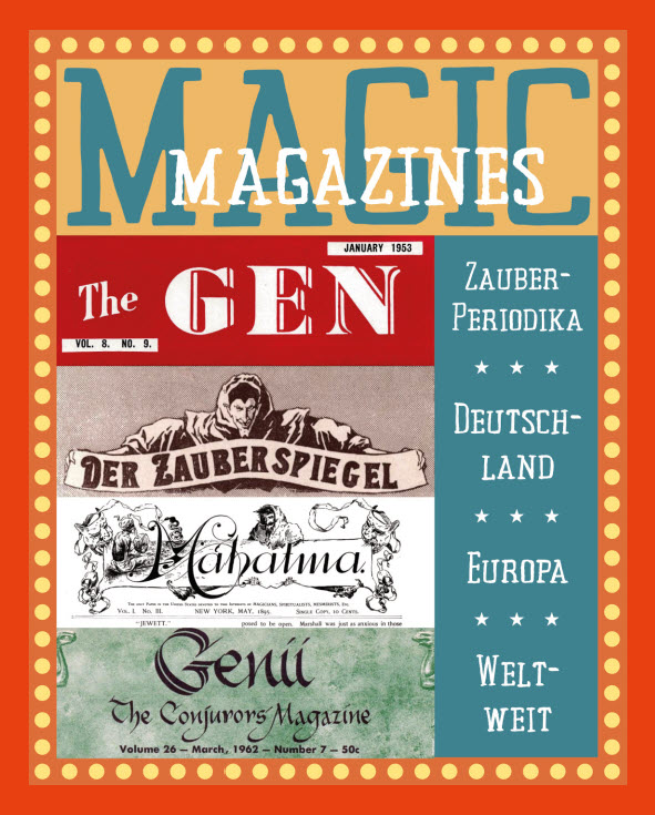 Es gibt einige Ausarbeitungen zu diesem Thema, die schon etwas älter sind. Erinnern möchte ich hier u. a. an Rudolf Braunmüller (1935-2001) mit „Das Deutschsprachige Zauberschrifttum“ von 1983. In englischer Sprache fand ich eine sehr schöne und mehrseitige Aufstellung von Wittus Witt unter dem Titel „Magic Magazines“ von 2011. Zu finden ist diese Arbeit über „Ask Alexander“. Im Text dieser Informationen stieß ich dann auf den Namen Hans-Dieter Moll (1925-1999), der eine Auflistung von dreißig Zaubermagazinen in Mickey Hades „Magic Shelf“ publizierte. Dann findet man in dem Buch „Who is Who in Magic“ von Bart Whaley (1928-2013) in einem Kapitel eine Auflistung von 224 Zaubermagazinen. Zwei sehr interessante Publikationen, die sich nur mit Zauberzeitschriften beschäftigen und von George L. Daily und James Bernard Alfredson (1937-2015) herausgebracht wurden, sind die Titel „A short Title Checklist of Conjuring Periodicals in English“ aus dem Jahr 1976 sowie „A Bibliography of Conjuring Periodicals in English: 1791-1983“ aus dem Jahr 1986 mit 395 Seiten. Ein weiteres Buch „Magic Magazines of the Second Millennium“ gilt als Ergänzung des 395-Seiten Buches. Es erschien im Jahr 2000, herausgegeben von Stephan A. Fernandes, 448 Seiten. Und nicht zu vergessen, in der „Magischen Welt“, Jahrgang Nr. 51 aus dem Jahr 2002 findet man zum Thema Zauberzeitschriften eine Serie von Peter Rawert in vier Folgen.