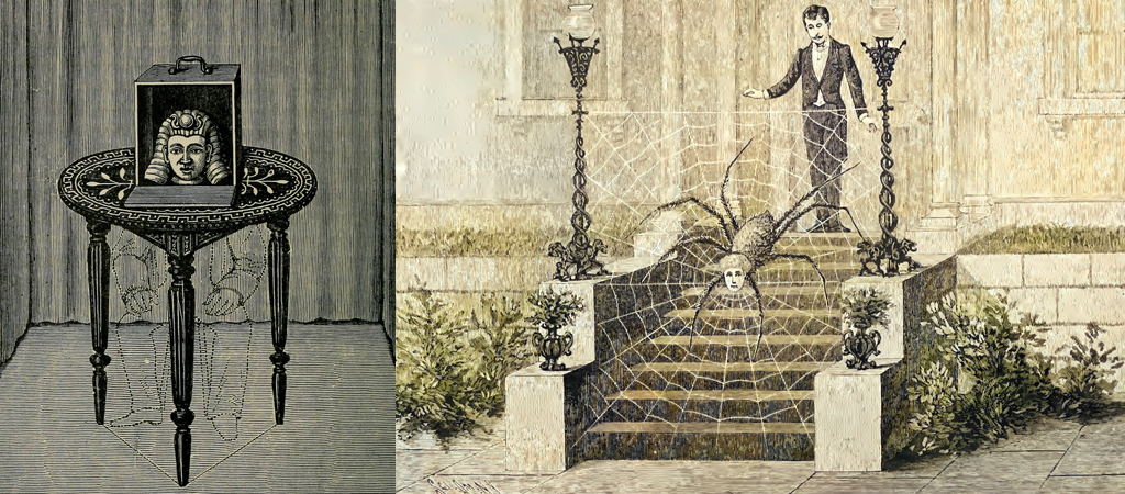 Er erzählt von einer Frau mit dem Namen Olga Hess, die ihren Kopf bei einem Zugunglück verloren hatte und durch den Arzt Dr. Landau am Leben gehalten wurde. Im Jahr 1937 kam diese Illusion durch Egon Heinemann in die USA. Dort wurde sie 1939 von Carl Rosini (1885-1969) auf der Weltausstellung in New York gezeigt. Eine Verbreitung der Illusion fand durch eine Beschreibung in dem Buch „Greater Magic“ und Baupläne, verkauft von Edward Murphy, statt. Die Frau ohne Kopf ist auch in dem 1944 gezeigten Film „La mujer sin cabeza“ mit David Bamberg zu sehen. Mit der Illusion „Spidora“, erfunden von Henry Roltair (1853-1910), wurde ein ähnliches Kunststück gezeigt, bei dem auf einer Treppe ein Spinnennetz gespannt war, in der Mitte saß die Spinne mit einem lebendigen Frauenkopf. Unter dem Titel „Helena, der Kopf des Deliquenten“, vermarktet durch Reinhold Pfalz, wird eine weitere Illusion dieser Art gezeigt. Hier liegen zwei Schwerter auf den Armlehnen eines Stuhls, auf dem ein lebender Kopf ruht, der singt und Fragen beantwortet.
